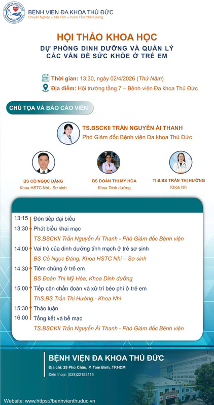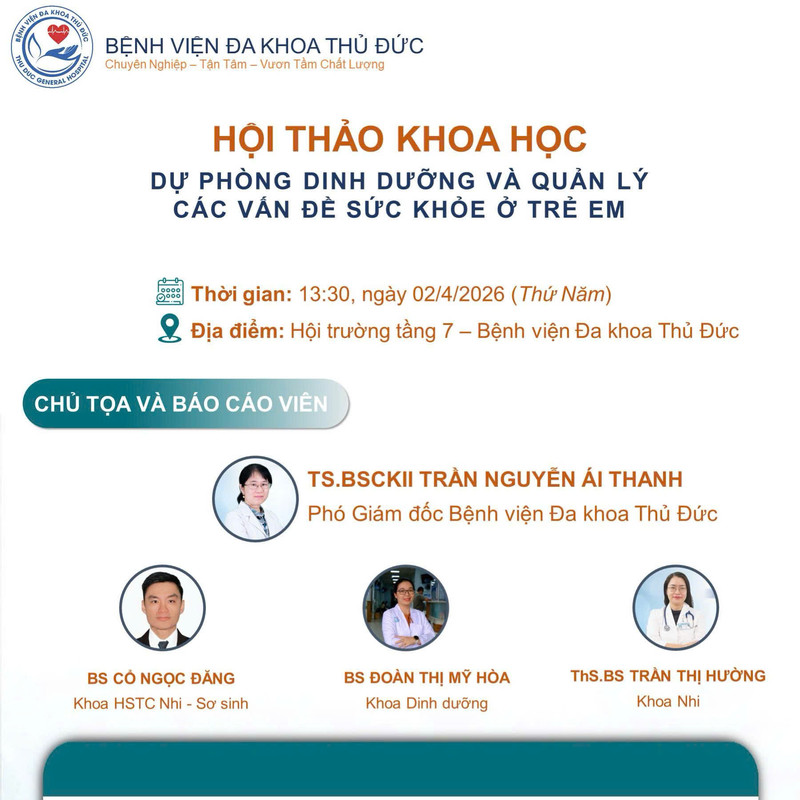 Trang chủ / Hội thảo HỘI THẢO "DỰ PHÒNG DINH DƯỠNG VÀ QUẢN LÝ CÁC VẤN ĐỀ SỨC KHỎE Ở TRẺ EM" Đón khách mời và check-in lúc 13g15 tại hội trường tầng 7 Đăng ký ngay Đăng ký ngay HỘI THẢO "DỰ PHÒNG DINH DƯỠNG VÀ QUẢN LÝ CÁC VẤN ĐỀ SỨC KHỎE Ở TRẺ EM" Thông tin chi tiết Thông tin Liên hệ Video Đón khách mời và check-in lúc 13g15 tại hội trường tầng 7 Thông tin chi tiết Liên hệ Video Khóa học liên quan Form đăng ký Bước 1: Thông tin đăng ký học Hình thức học Hình thức tham dự * Trực tiếp Trực tuyến Khóa học BẰNG CHUYÊN MÔN Chọn bằng cấp Bác sĩ Bác sĩ y học cổ truyền Y sĩ Cử nhân y khoa Dược sĩ Điều dưỡng Kỹ thuật viên y học Hộ sinh NĂM TỐT NGHIỆP CHUYÊN NGÀNH ĐĂNG KÝ Chọn chuyên ngành Bác sỹ y khoa Bác sỹ y học cổ truyền Bác sỹ y học dự phòng Bác sỹ răng hàm mặt Bác sỹ chuyên khoa dinh dưỡng Y sỹ đa khoa Y sỹ y học cổ truyền Điều dưỡng Hộ sinh Kỹ thuật y Dinh dưỡng lâm sàng Tâm lý lâm sàng Cấp cứu viên ngoại viện SCAN VĂN BẰNG Tải tệp PDF vào đây Bước 2: Thông tin học viên HỌ VÀ TÊN GIỚI TÍNH Chọn giới tính Nam Nữ Khác NGÀY SINH NƠI SINH Chọn Tỉnh/Thành phố An Giang Bắc Giang Bắc Ninh Cà Mau Cao Bằng Đắk Lắk Điện Biên Đồng Nai Đồng Tháp Gia Lai Hà Tĩnh Hưng Yên Khánh Hòa Lai Châu Lạng Sơn Lào Cai Lâm Đồng Ninh Bình Nghệ An Phú Thọ Quảng Ninh Quảng Ngãi Quảng Trị Sơn La Tây Ninh TP. Cần Thơ TP. Đà Nẵng TP. Hà Nội TP. Hải Phòng TP. Hồ Chí Minh TP. Huế Tuyên Quang Thái Nguyên Thanh Hóa Vĩnh Long CMND/CCCD NGÀY CẤP NƠI CẤP ĐIỆN THOẠI EMAIL ẢNH THẺ Tải tệp ảnh vào đây Bước 3: Thanh toán Nếu thanh toán sau, bạn có thể bỏ qua bước này. Cách 1: Quét mã QR để thanh toán ⬇️ Tải QR về máy Cách 2: Chuyển khoản thủ công Đơn vị: Bệnh viện Đa khoa Thủ Đức Địa chỉ: 29 Phú Châu, Phường Tam Bình, TP.HCM Ngân hàng: Vietcombank Số tài khoản: 0381000519413 Số tiền: VNĐ Nội dung: ⚠️ Vui lòng nhập chính xác nội dung khi chuyển khoản 📎 File đính kèm giao dịch Cho phép JPG, PNG hoặc PDF (tối đa 5MB) Tôi đồng ý với các điều khoản và quy định của Bệnh viện. Quay lại Tiếp theo Gửi Đăng Ký Thông tin đăng ký Vui lòng điền đầy đủ và chính xác thông tin để được cấp CME. Nhập tiếng Việt có dấu, viết hoa và viết thường đúng quy định. Chọn giới tính * Nam Nữ Hình thức tham dự * Trực tiếp Trực tuyến -- Chọn Lớp -- * Thông tin bắt buộc Đăng ký ngay Đăng ký thành công! Hãy kiểm tra email của bạn, có thể trong thùng rác hoặc nội dung cập nhật. Đóng Lỗi Nội dung lỗi sẽ xuất hiện ở đây.